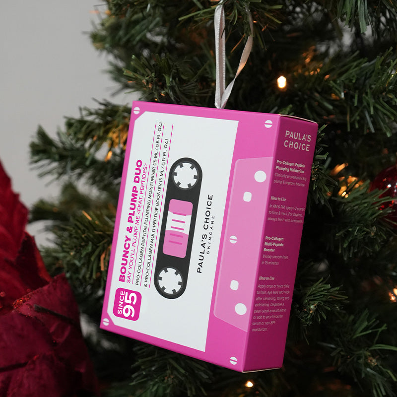 Give the gift of firm, youthful-looking skin. This cassette-packaged duo hangs beautifully on any Christmas tree — a cute ornament with powerful skin benefits inside.